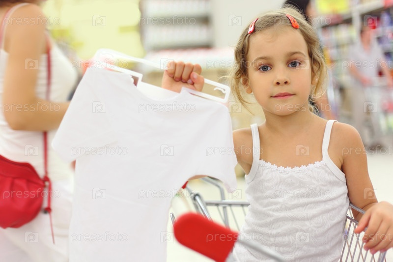 Маленькая девочка сидит в тележке магазина и держит вешалку с белой рубашкой,