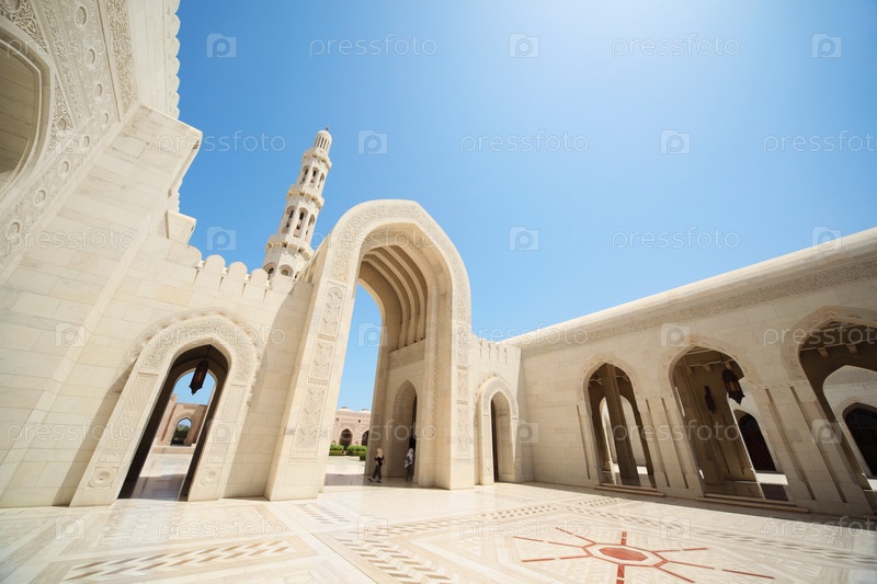 ОМАН - 13 апреля 2010 года: красивая архитектура внутри Великой мечети в