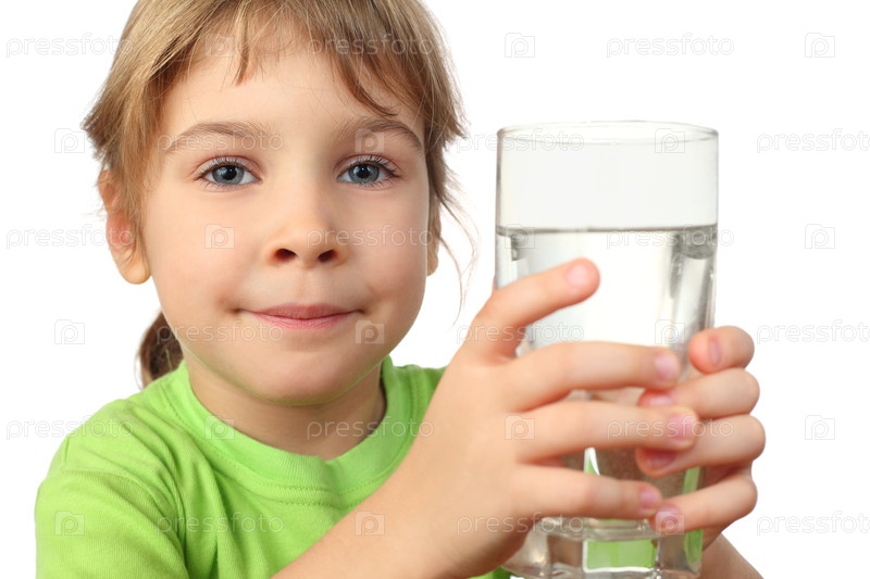 Портрет маленькой девочки в зеленой рубашке, держащей стакан с водой и