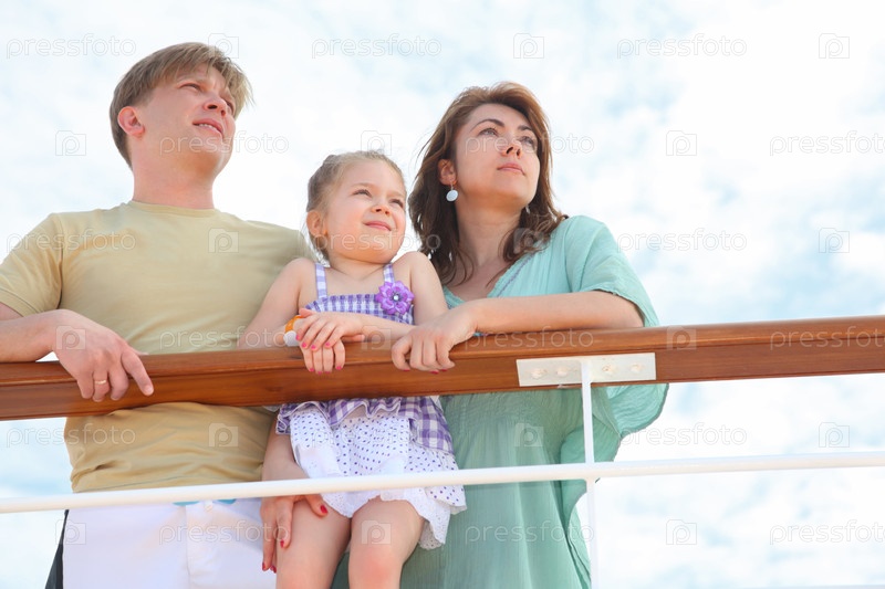 Семья с дочерью, стоящей на палубе круизного лайнера возле железной дороги, ребенок