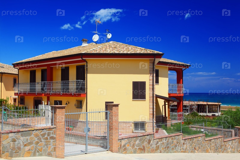 Ярко-желтая вилла с черепичной крышей и балконом
