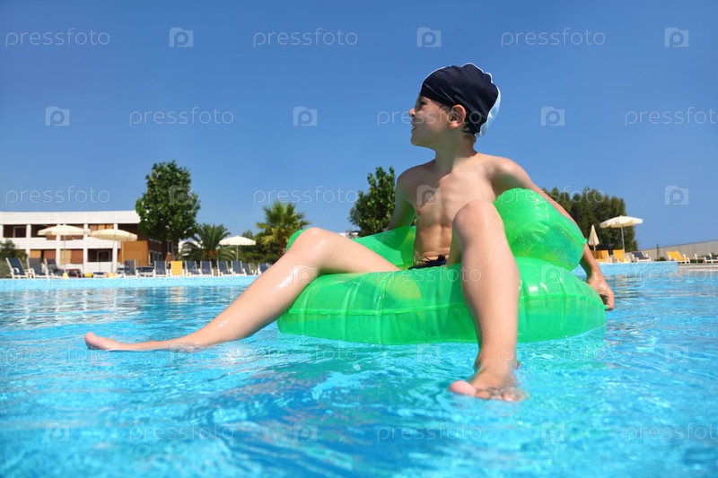 Мальчик сидит на зеленом надувном кресле для купания в бассейне и смотрит