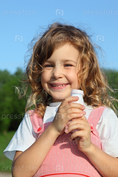 Красивая маленькая девочка с небольшой бутылочкой йогурта, против w