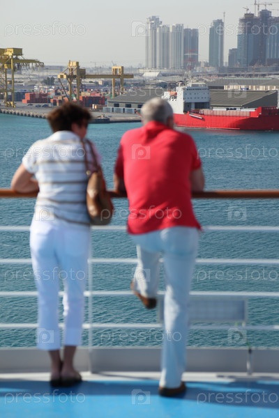 Мужчина и женщина стоят на палубе круизного лайнера и смотрят в порт. мужчина