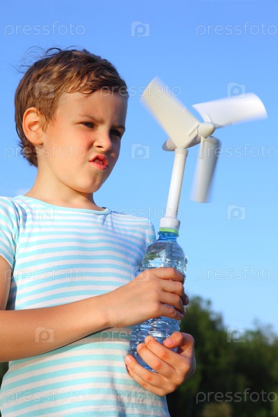 Маленький мальчик против голубого неба играет с ветровым генератором