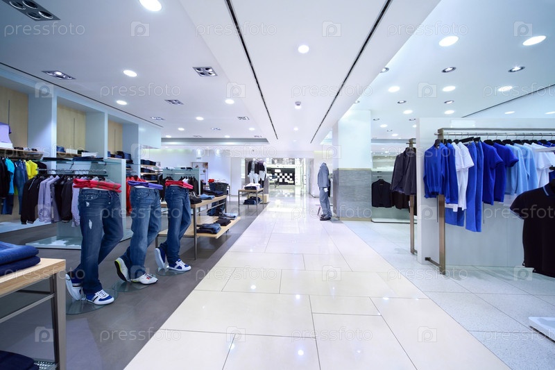 Современный розничный магазин с стойками для одежды и полированными напольными плитками