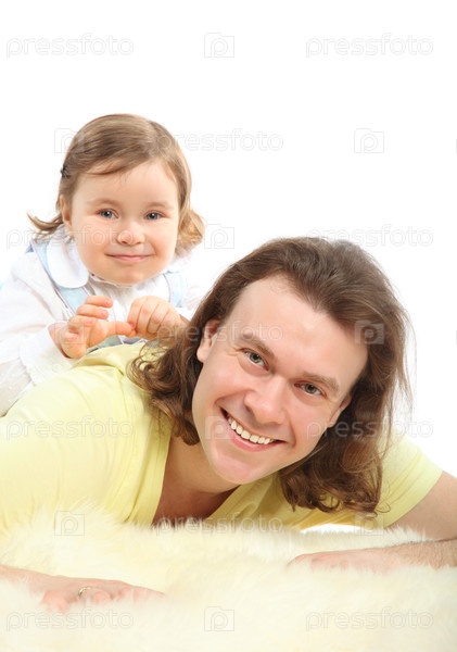 Счастливая дочка сидит на отце, который лежит на белом шерсти