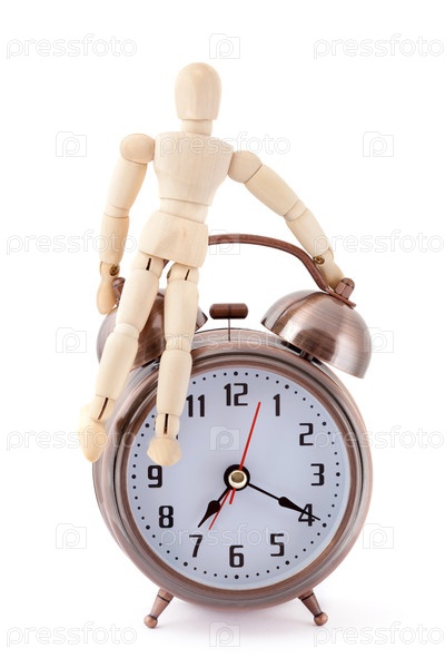 Деревянная фигура опирается на старинный будильник