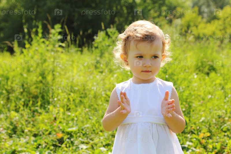 Маленькая девочка в белом платье стоит на улице