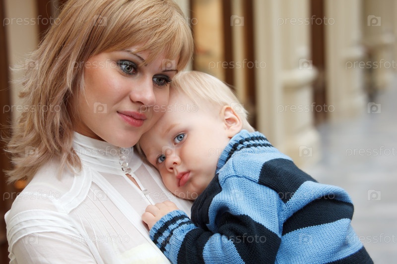 Мать держит младенца близко, оба смотрят на камеру