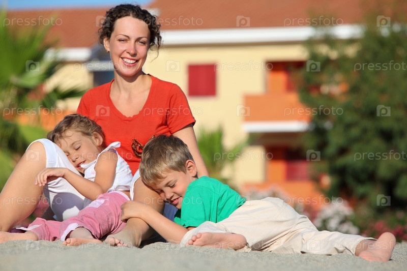 Пара голубей играет с матерью на пляже на песке, лежа для этого на коленях