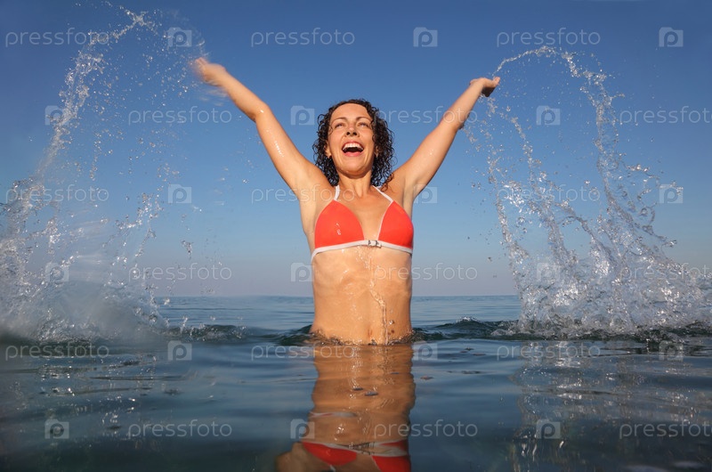Молодая красивая женщина в красном купальном костюме прыгает в море. капли