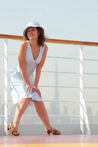 Молодая красавица брюнетка женщина стоит на палубе круизного лайнера, руки на руках