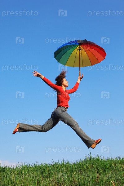 Девушка прыгает по зеленой траве с цветным зонтиком в руке