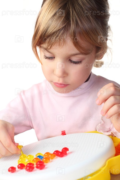 Маленькая девочка в розовой рубашке играет с красочной пластиковой мозаикой и