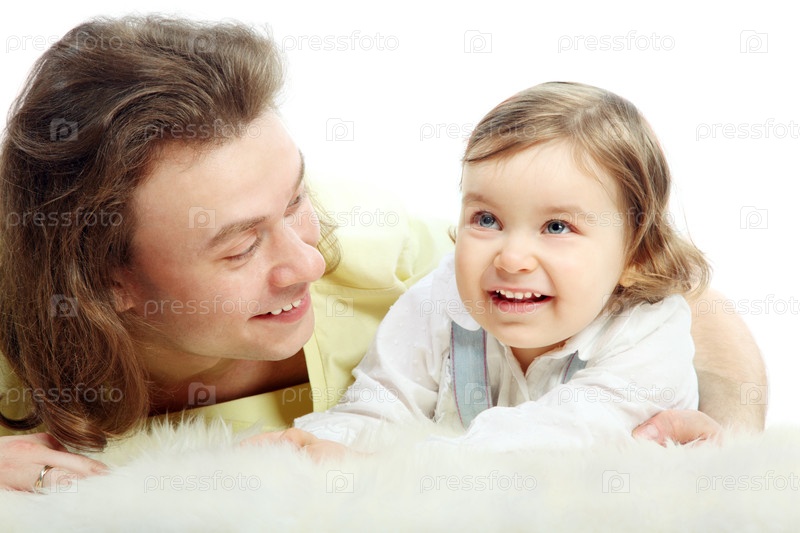 Отец обнимает свою маленькую дочь, и они лежат на белом мехе