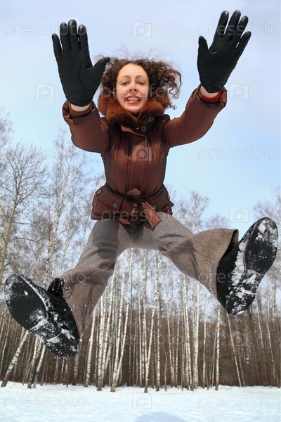 Женщина радостно прыгает в снежных лесах
