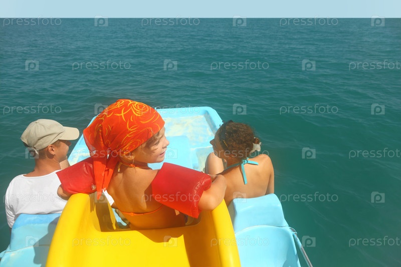 Семья с девочкой на педальной лодке с желтой горки в море, вид из