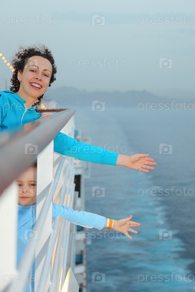 Веселая красивая женщина со своей дочерью стоит на палубе круизного лайнера