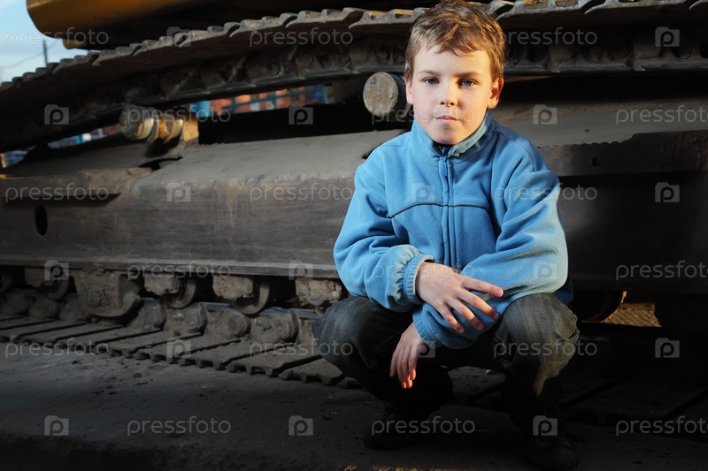 Молодой мальчик приседает возле большой промышленной машины
