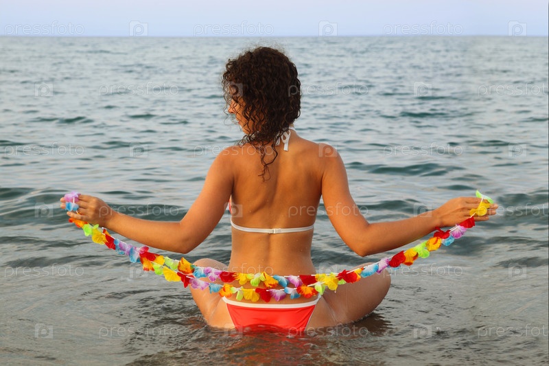 Молодая женщина, одетая в купальный костюм и держащая гирлянду красоты