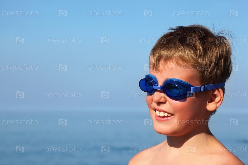 Юный мальчик улыбается, надев голубые купальные очки