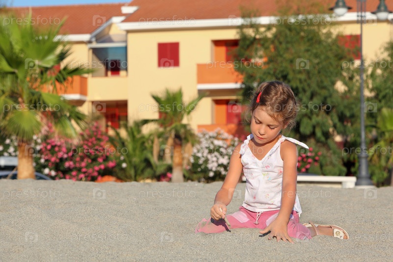Девушка сидит в дневное время на пляже и с интересом ведет маленькую палку