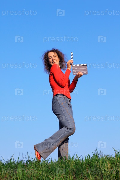 Девушка стоит на лугу с зеленой травой против голубого неба и продолжает говорить