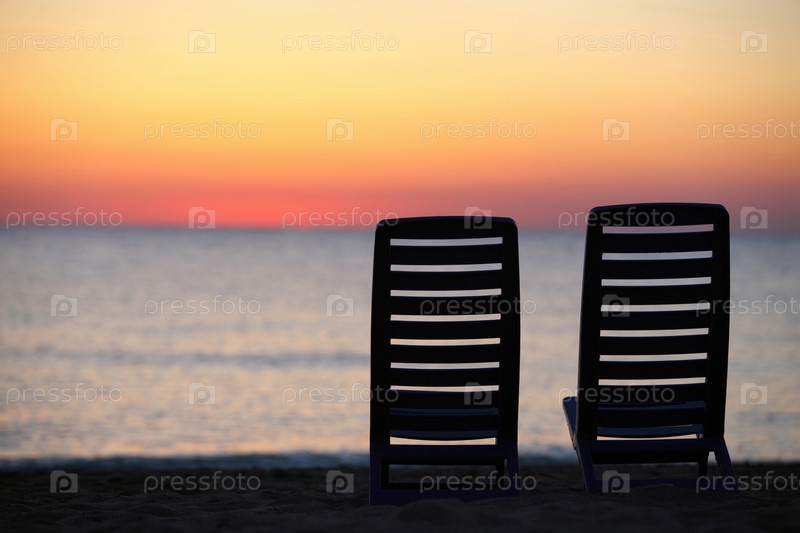 Вечером на берегу моря два пластиковых стула стоят