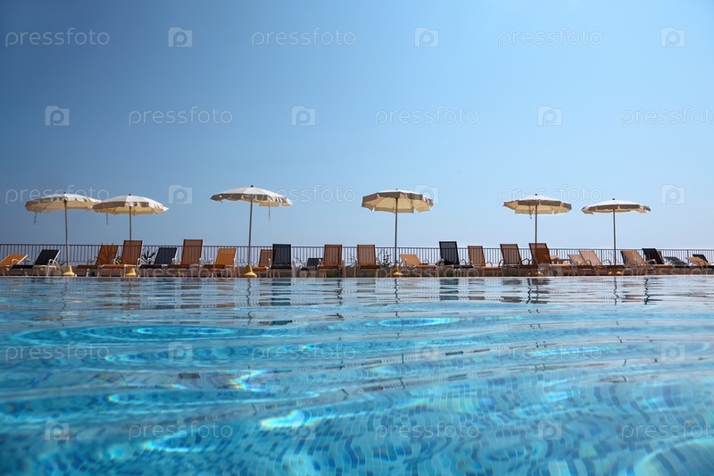 На краю бассейна возле забора стоят кресла с открытым пляжем