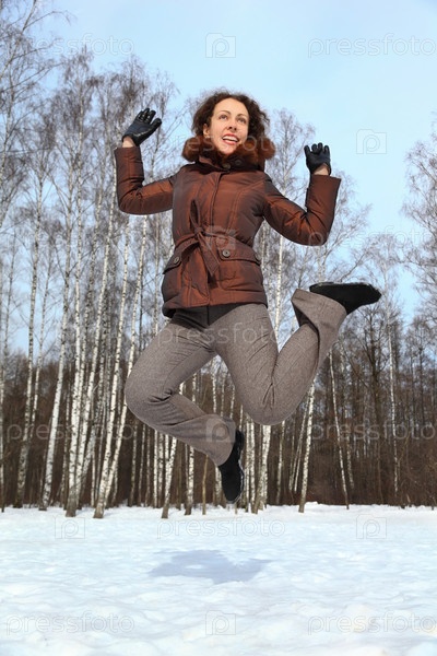 Женщина радостно прыгает в снежном лесу