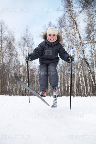 Молодой мальчик прыгает на лыжах внутри зимнего леса в солнечном свете
