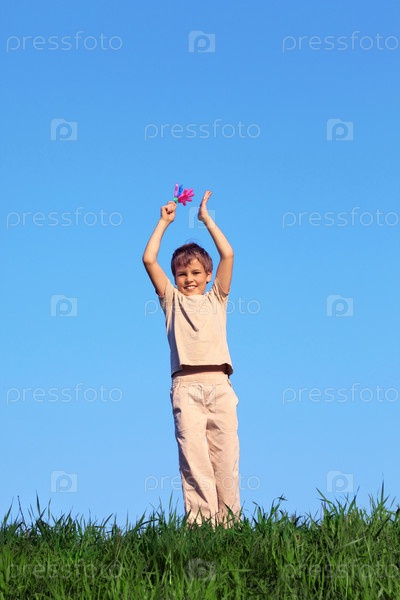 Улыбающийся мальчик стоит на поле с зеленой травой против голубого неба и держит