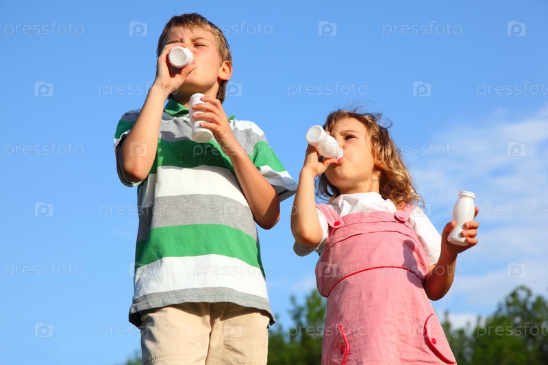 Маленький мальчик и девочка против голубого неба, с удовольствием внутри