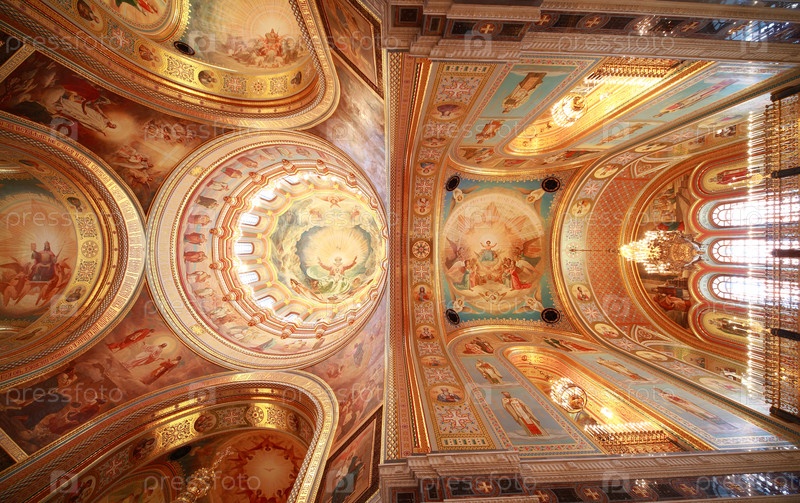 Снимок потолка возле балкона внутри собора Христа Спасителя