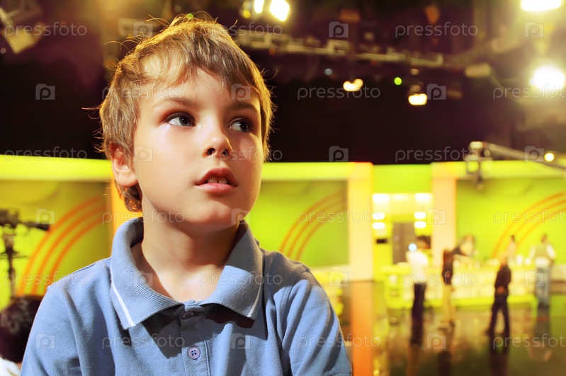 Маленький мальчик стоит со скрещенными руками в аудитории против