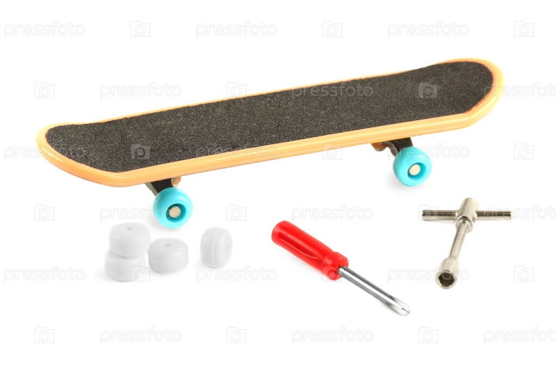 Черный скейтборд с желтым краем и голубым колесом возле инструментов и