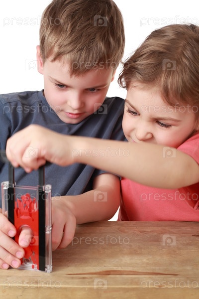 Два ребенка изучают маленькую красную стеклянную коробку