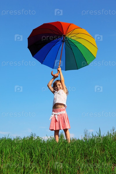 Улыбающаяся девушка стоит на зеленой траве на фоне синего неба с цветными