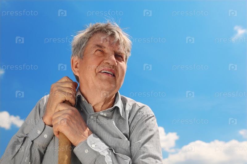 Старый старший в полосатой рубашке с толчком, улыбающийся и смотрящий со стороны,