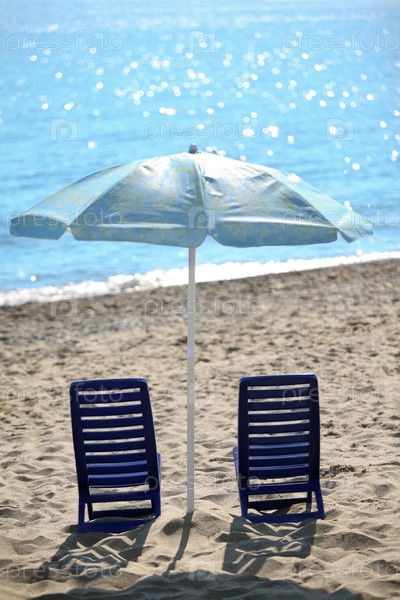 На берегу в дневное время на песке два пустых пластиковых стула стоят менее