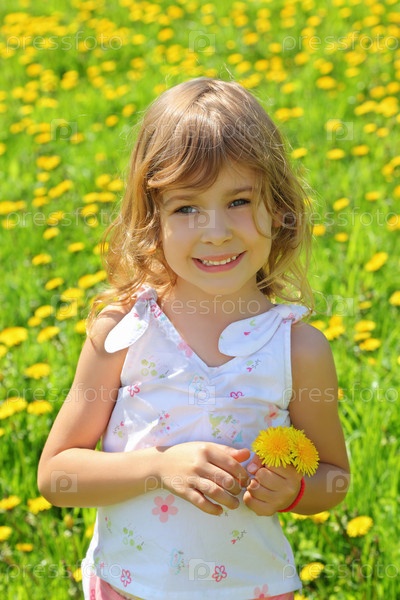 Маленькая девочка улыбается, держа в руках желтый одуванчик на лугу