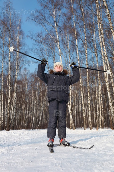 Молодой мальчик стоит на лыжах, смотрит в небо и волновые столбы