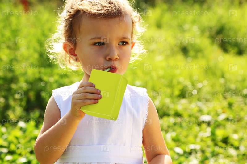 Маленькая девочка глотает зеленый напиток на свежем воздухе