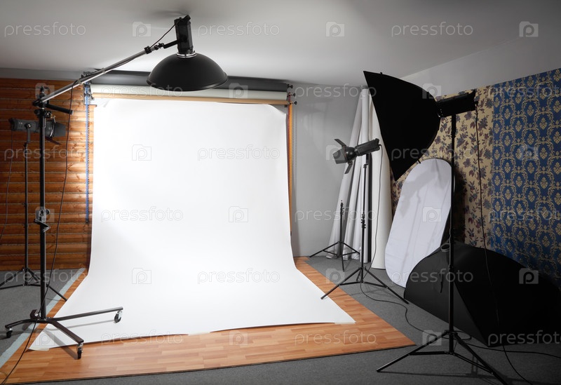 Белый фон внутри студии - темная комната, освещенная большими лампами и