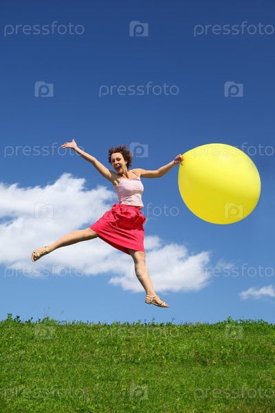Женщина летом отталкивается от земли и на крыле держит желтый