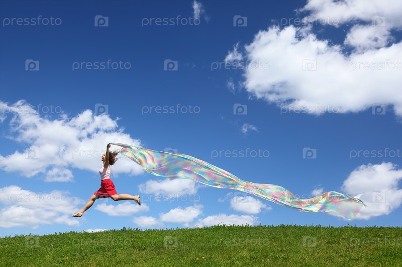 Женщина летает по небу с куском ткани в руках, которая развивается вниз