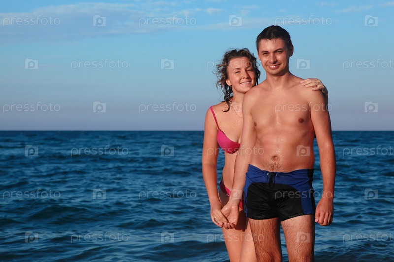 Молодая пара улыбается у воды океана