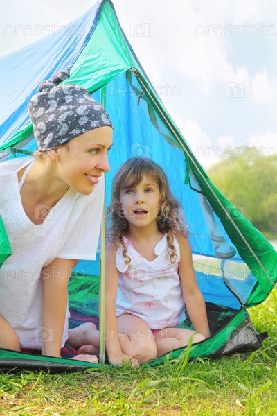 Мать и ребенок внутри зеленой палаты для кемпинга