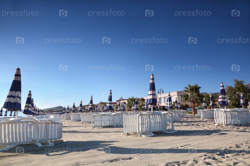 Шезлонг с зонтиками - это аккуратно построенные ряды утром на пляже